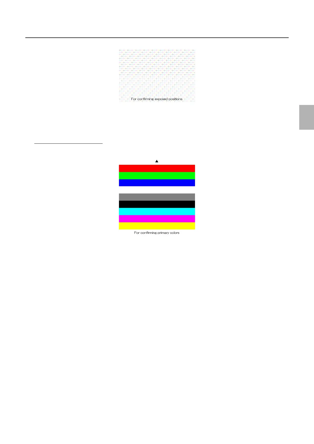 1. Confirm that each color of red, green, blue, white, gray, black, cyan, magenta and yellow is correctly exposed.
