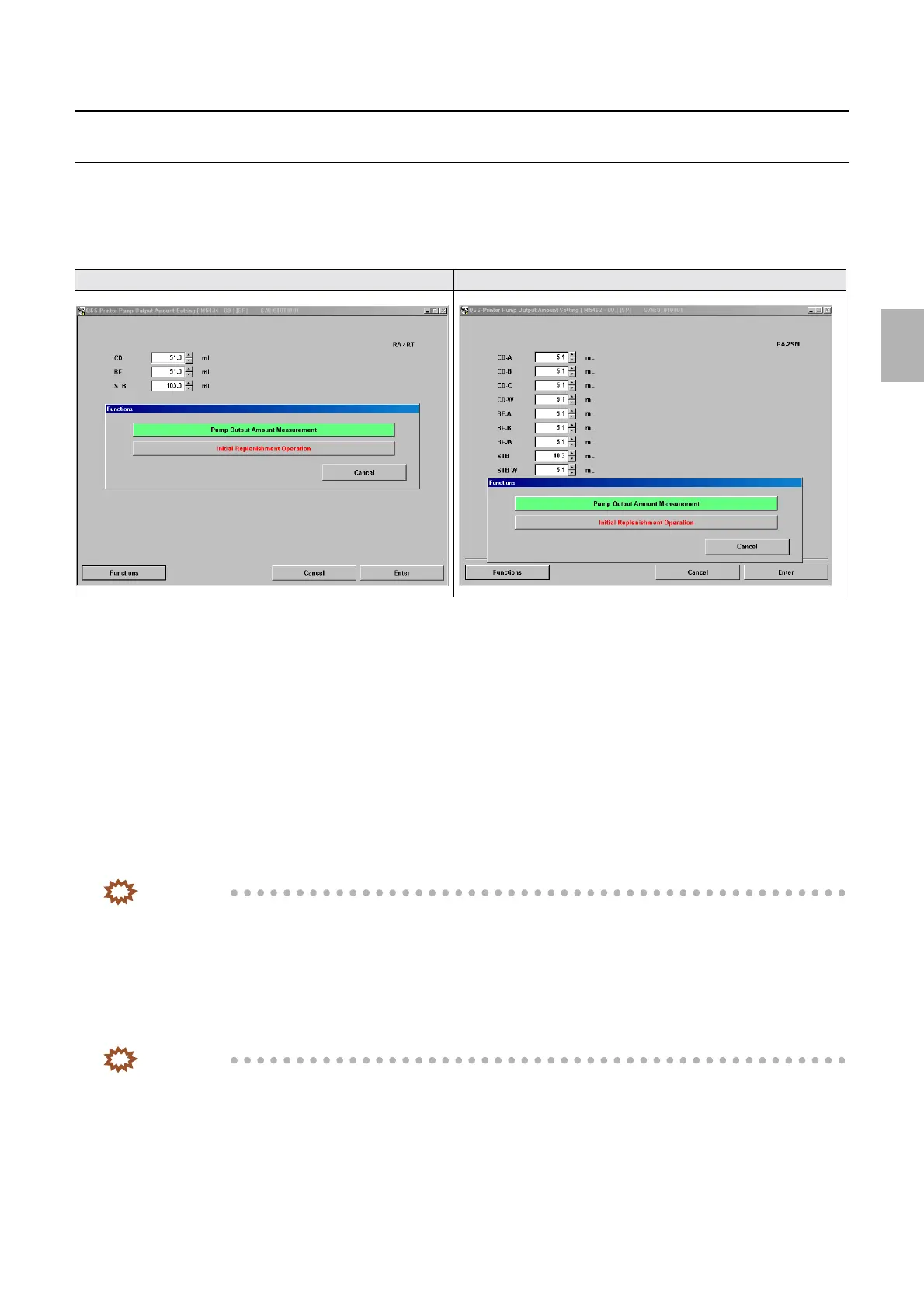 In Pump Output Amount Setting via F: Functions, output amount of each replenisher pump is measured and compared with the set