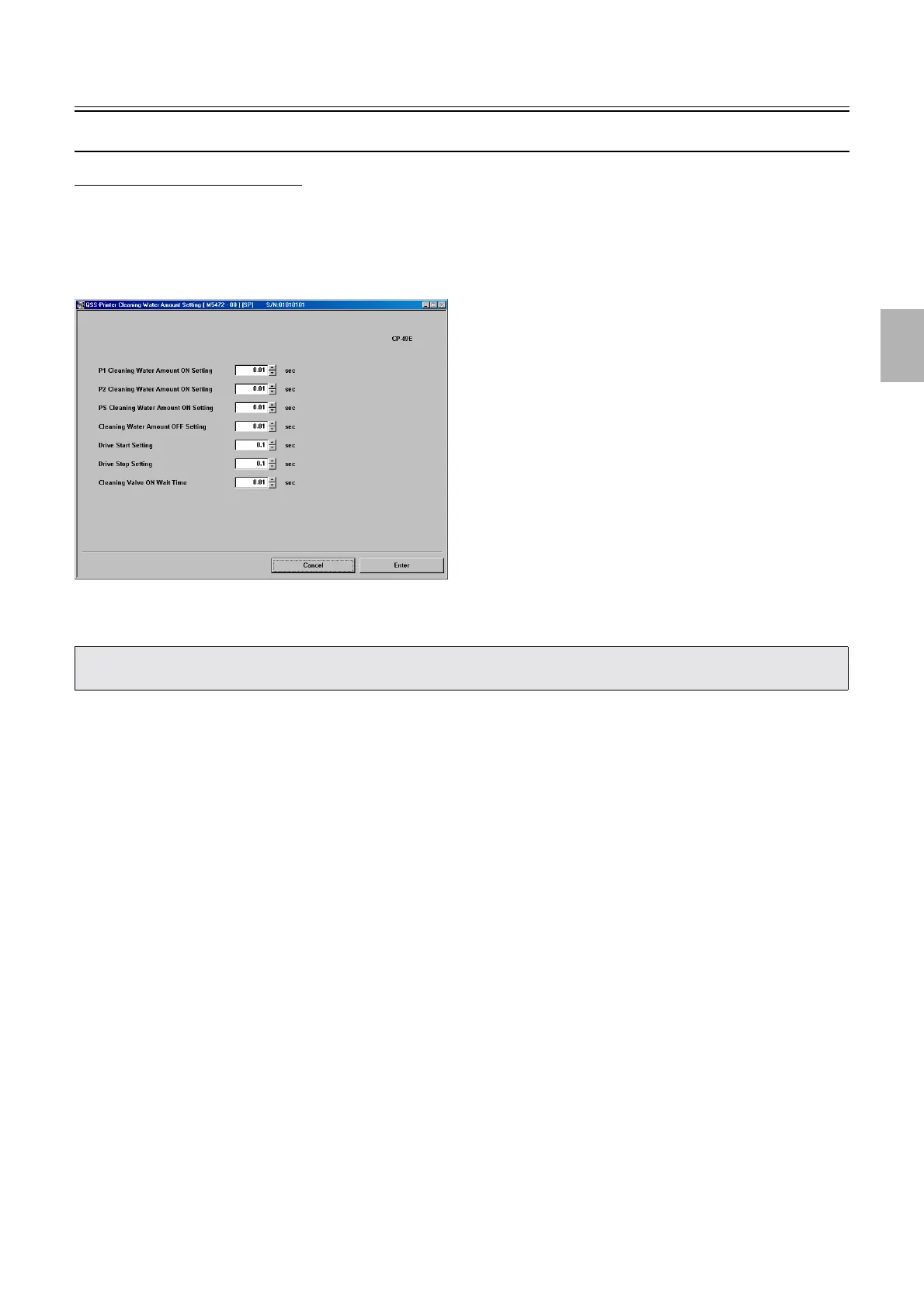 ! PS Cleaning Water Amount ON Setting (Initial value: 7.60) (input range: from 0.01 to 10.00 seconds)