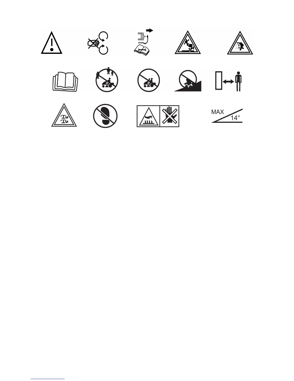 Lames rotatoires Ne pas monter Ne pas toucher – Risque de brűlures Inclinaison de travail maximale 14°