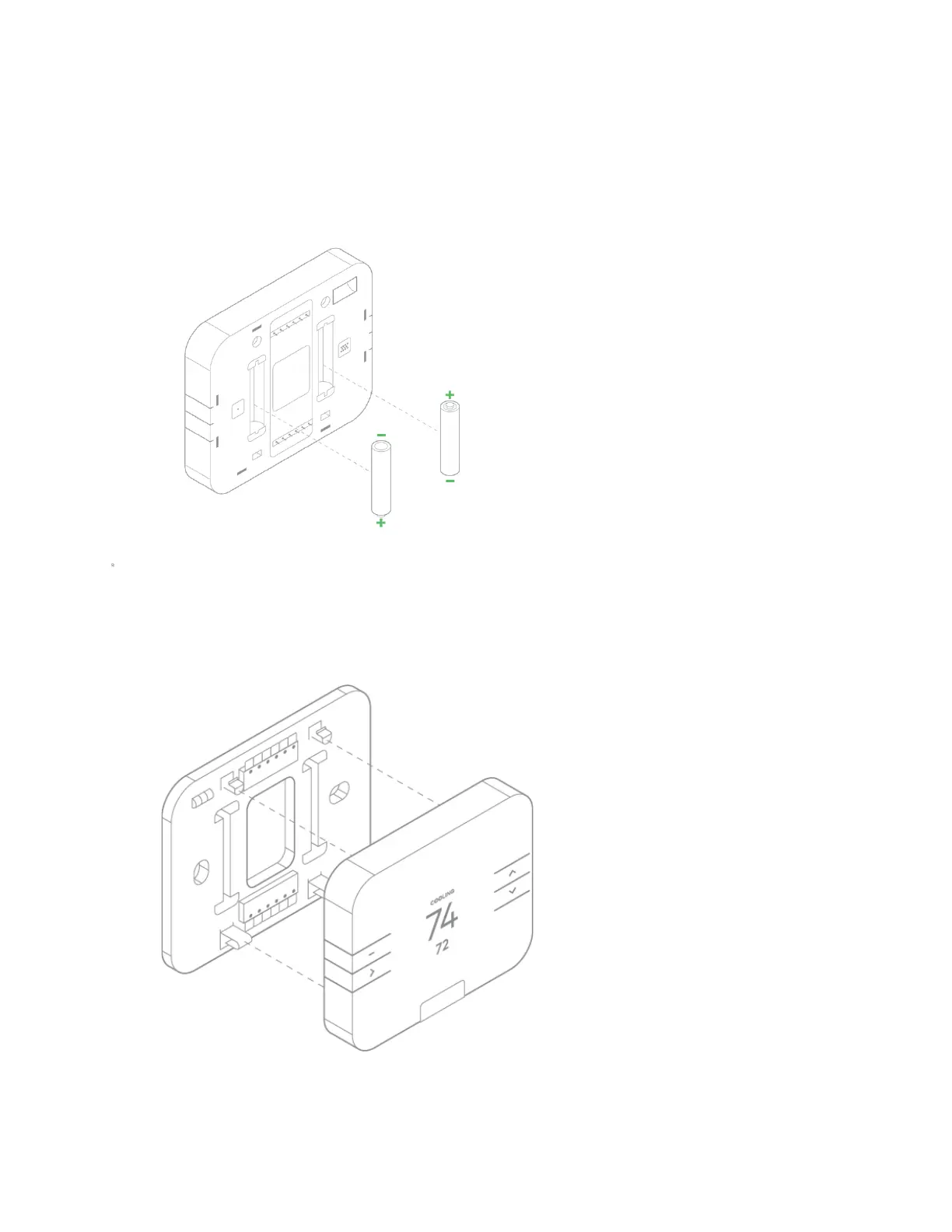 14. Press the thermostat body firmly into the back plate mounted on the wall, verifying that the pins on the body are correctly
