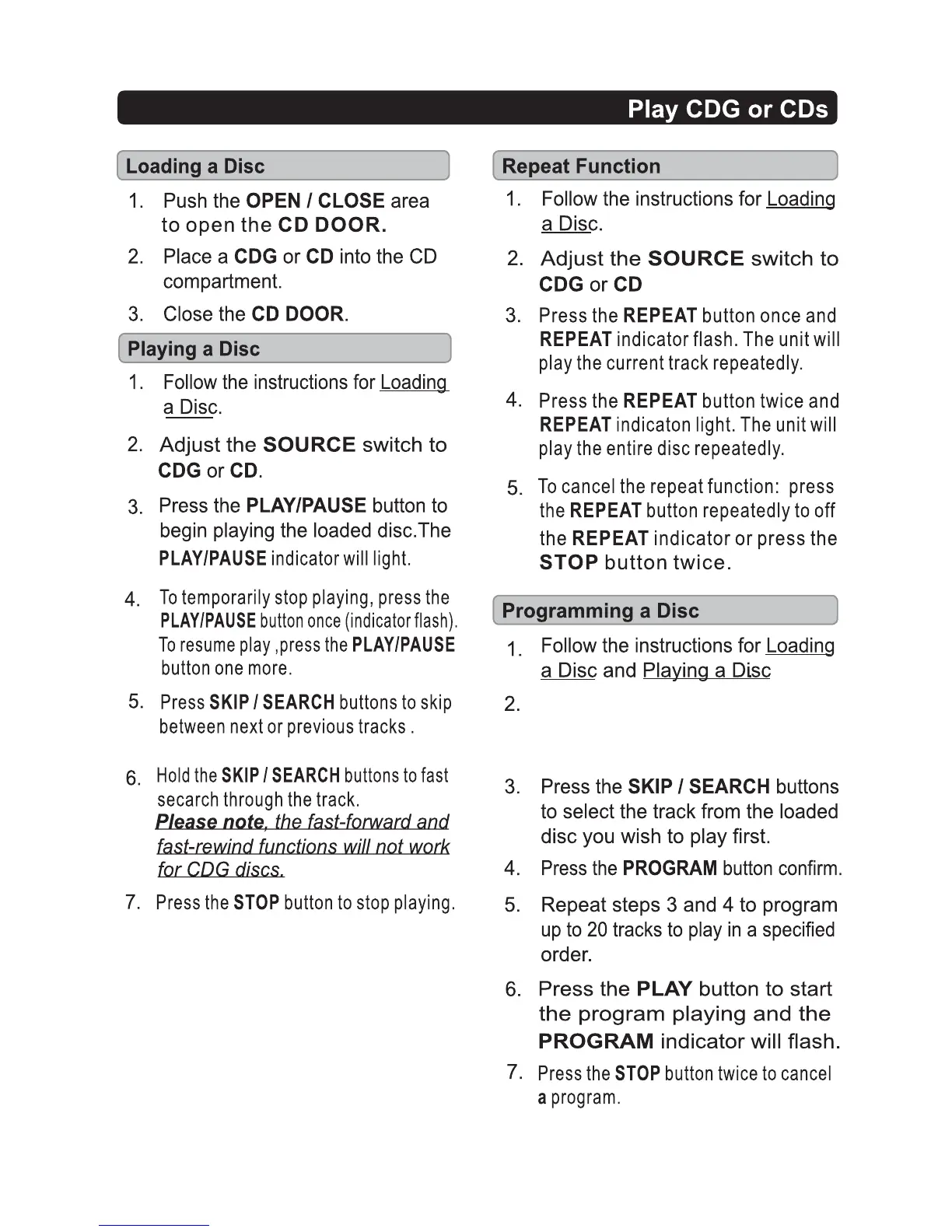 FROZEN 69127-WINT - Playing CDG and CDs; Disc Loading and Playback Operations