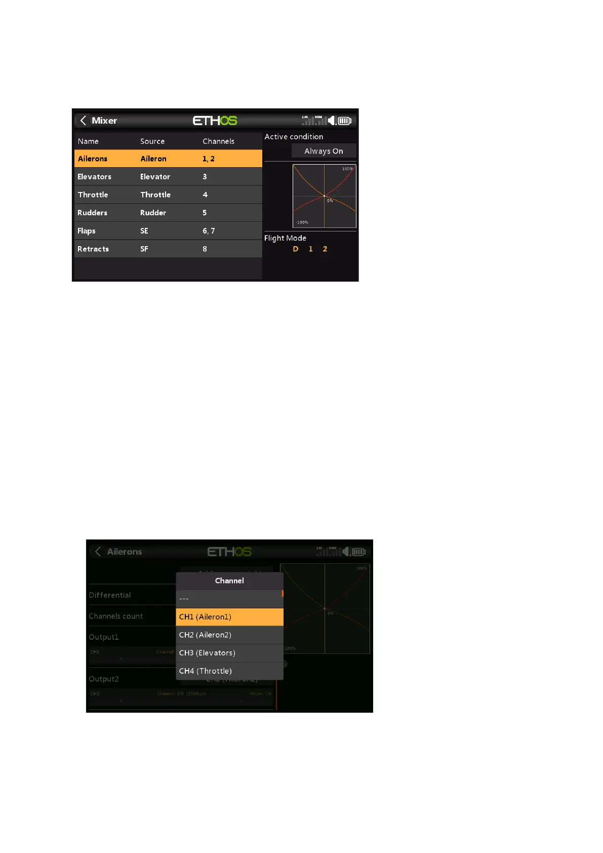 a) Go to Model / Mixers, and tap on CH1 (Aileron1) to highlight it.