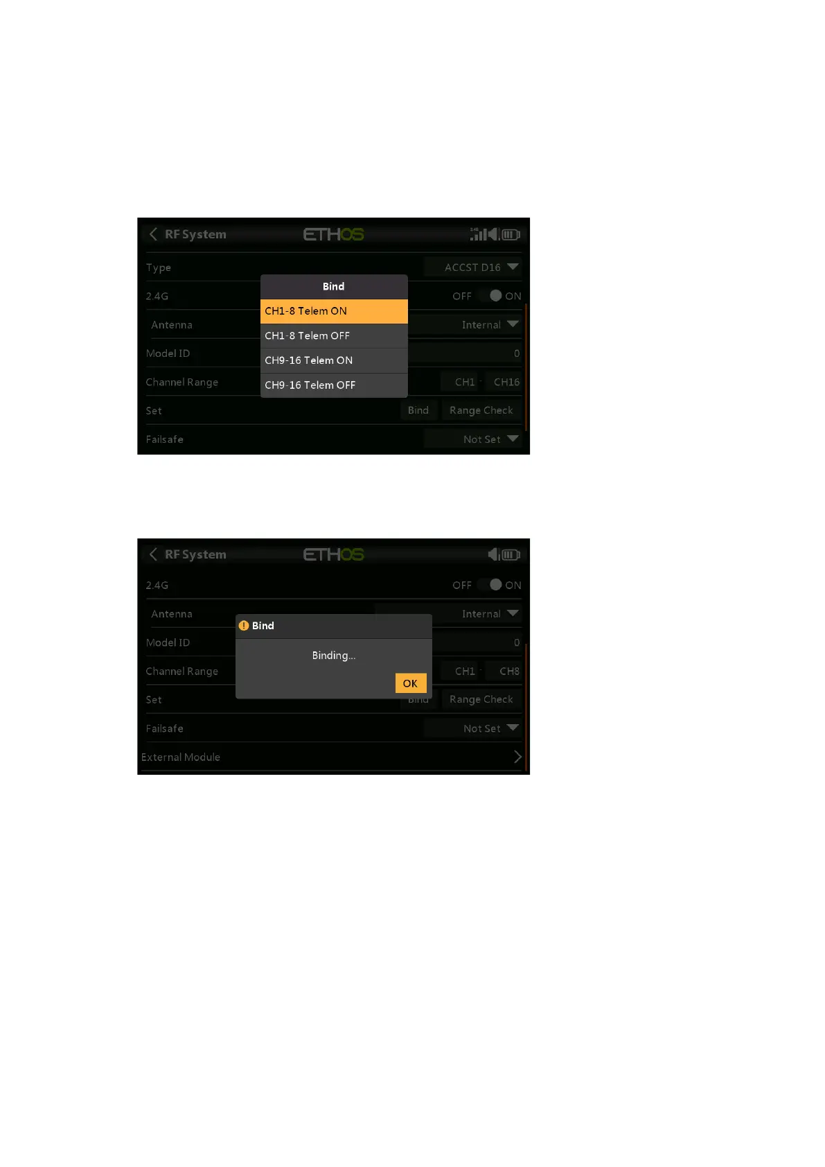 4. Tap OK on the transmitter to end the Bind process, and power cycle the receiver.