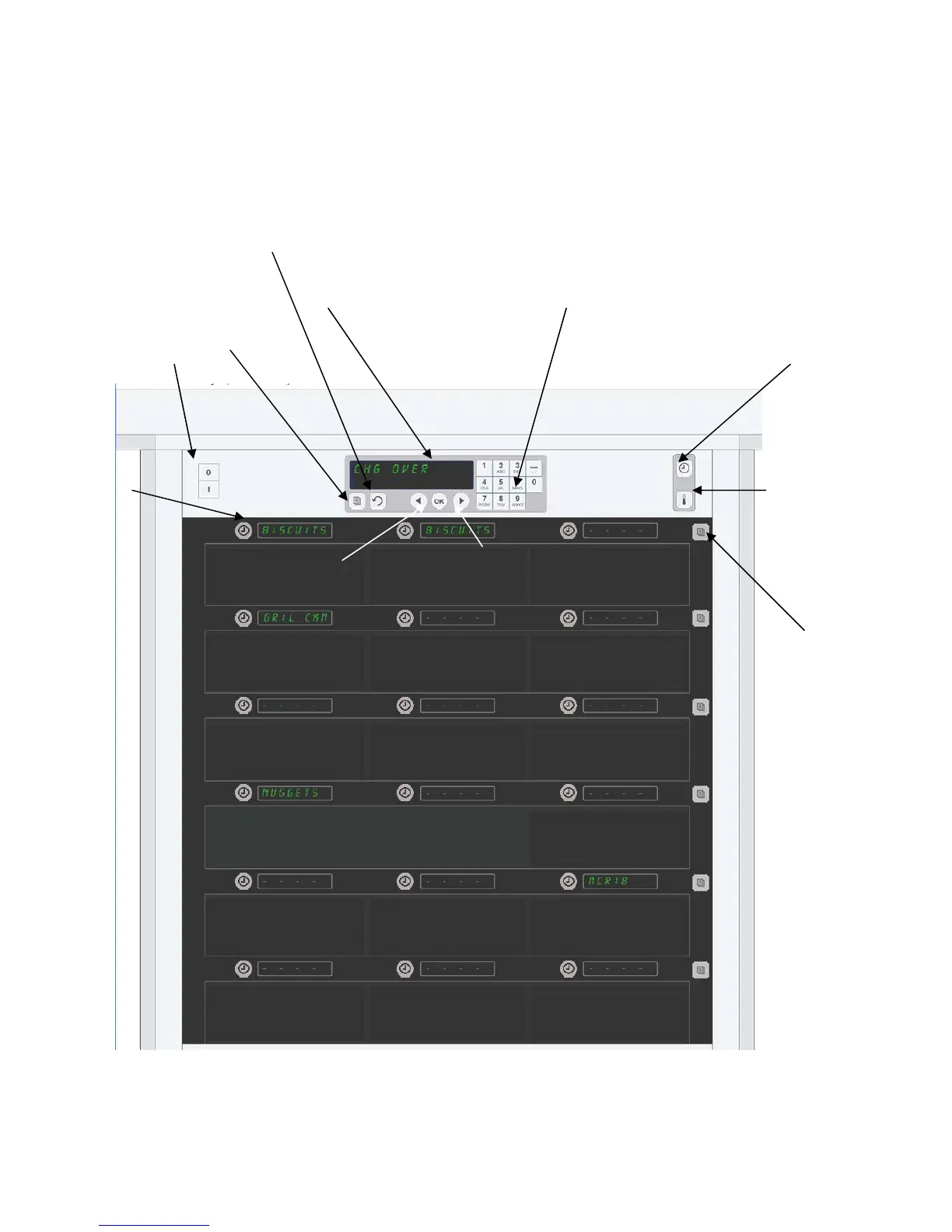 each or three rows, which hold three trays each. Each row position has a display, which indicates