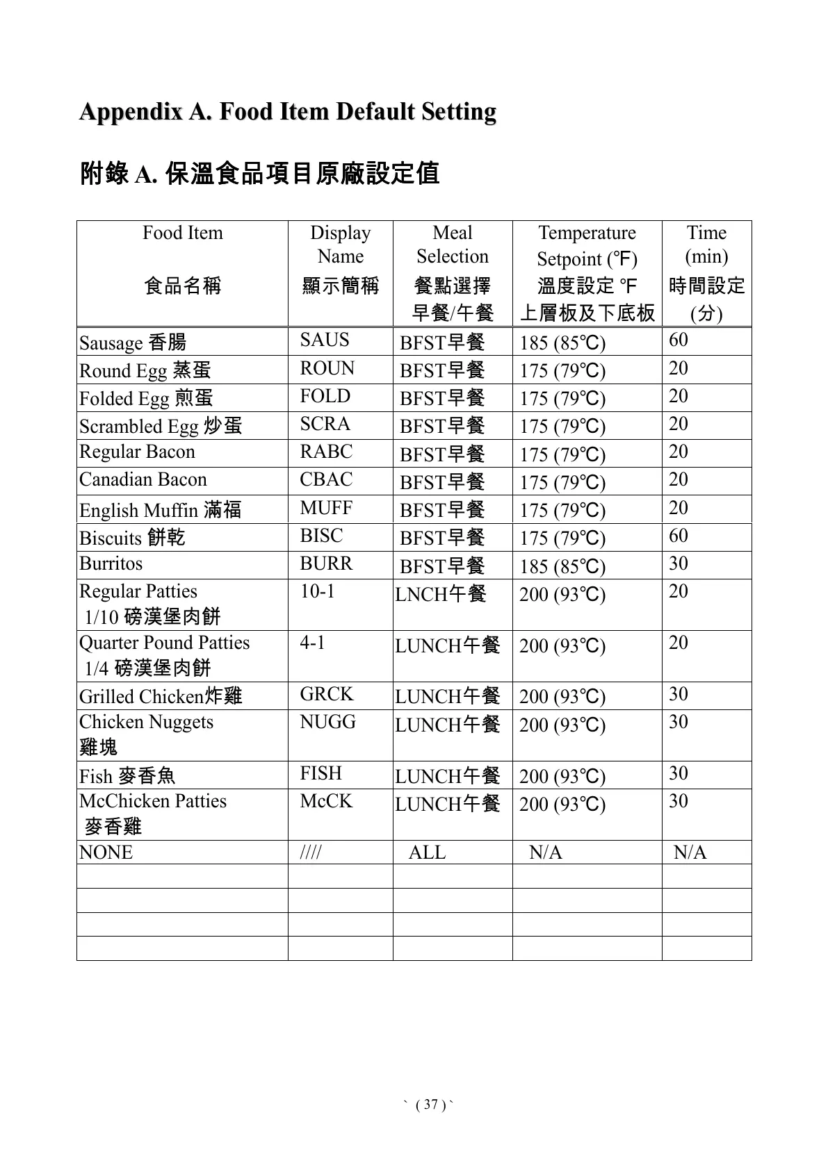 Frymaster UHC - Appendix A: Food Item Default Settings