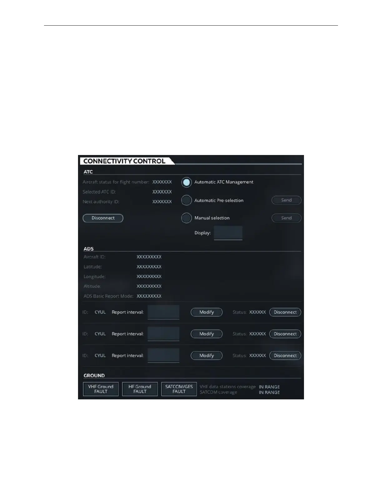 to ATC and ADS centers and displays Ground Communication status.