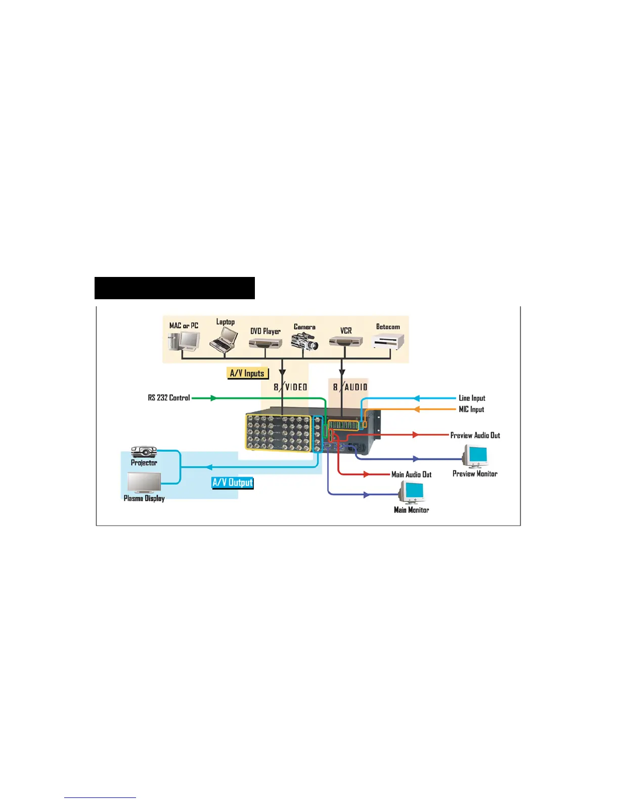 and a full-featured control panel in a single integrated package. Eight universal A/V inputs accept composite video, s-