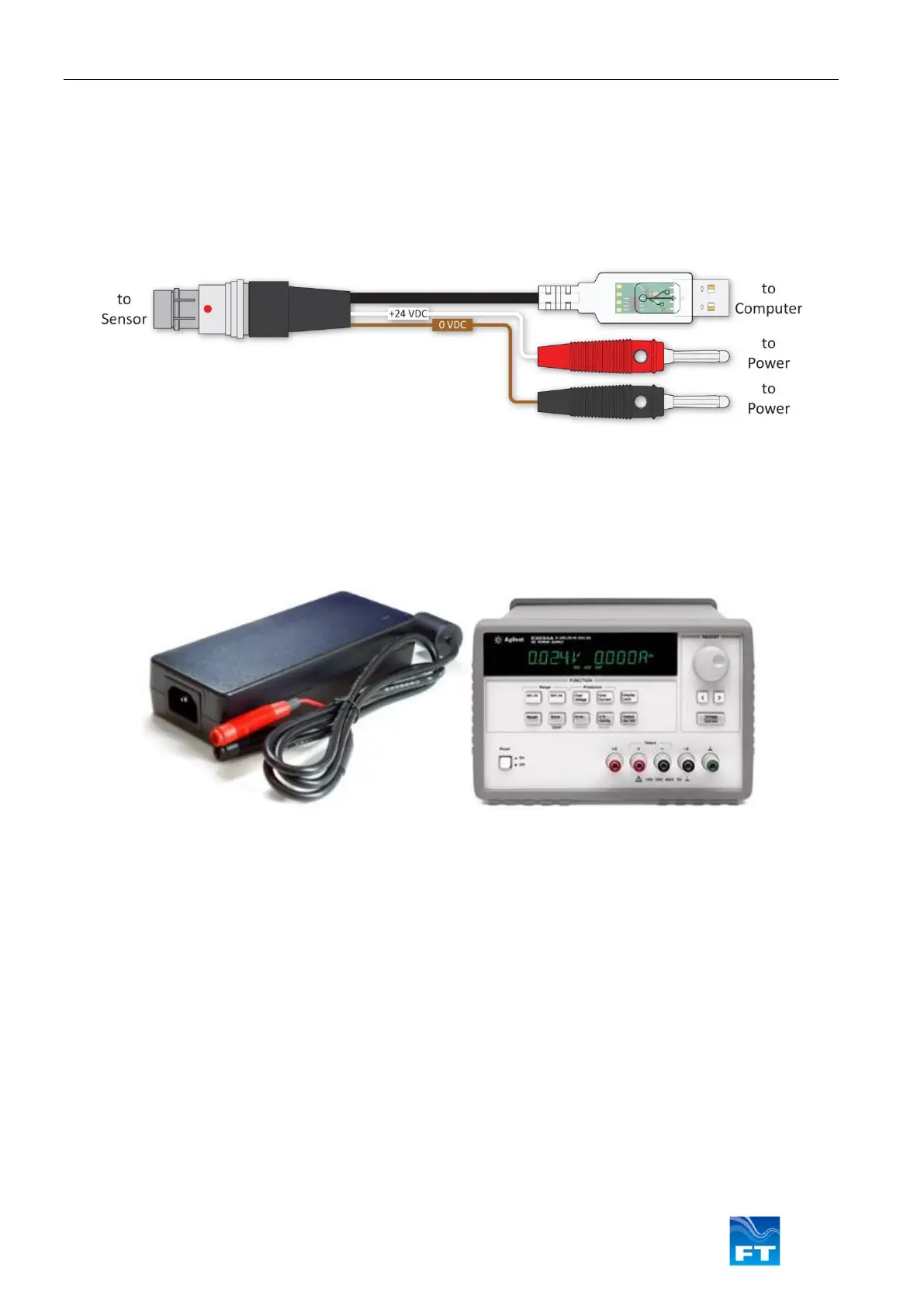 test of the FT sensors. The kit connects the sensor to a power supply and a Windows PC using virtual COM ports.