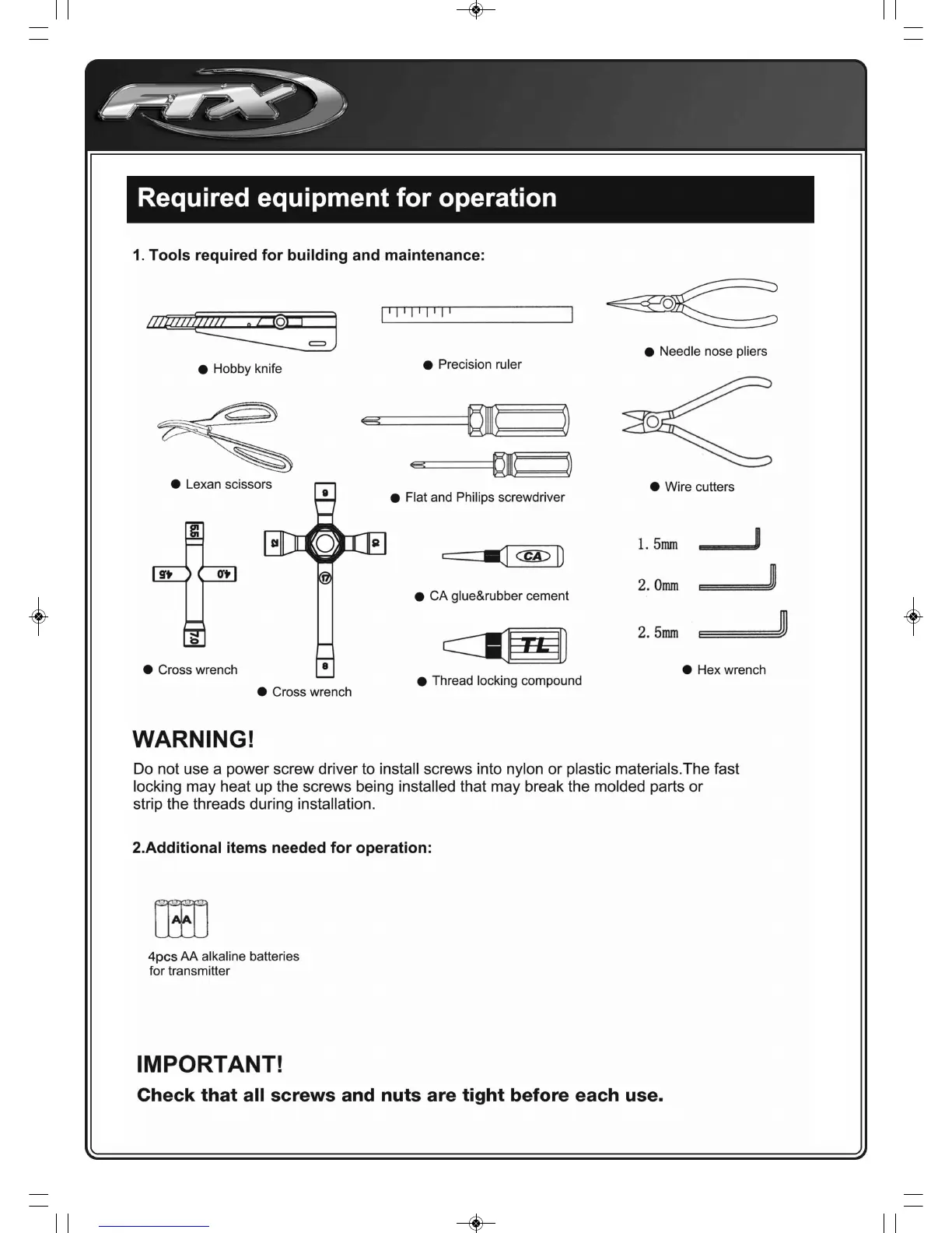 FTX BANZAI - Required Equipment for Operation; Tools for Assembly and Maintenance; Additional Items for Initial Use