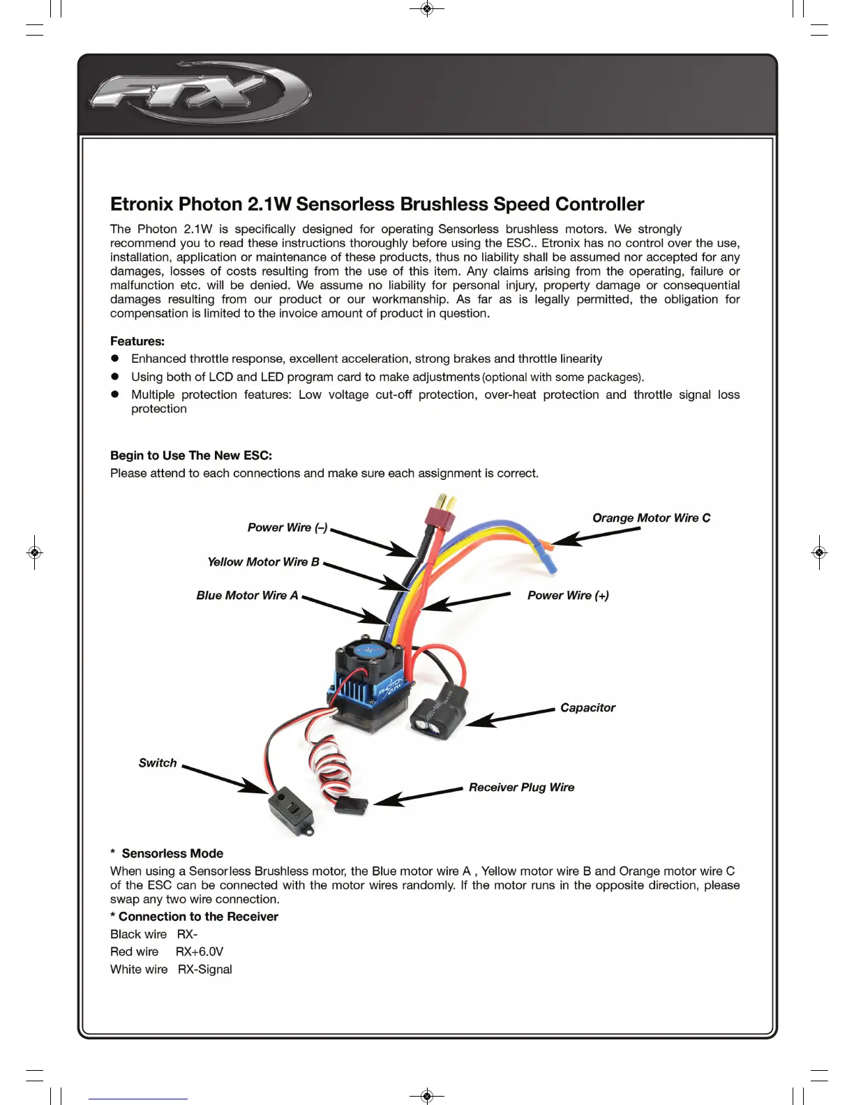 FTX Carnage - Etronix Photon 2.1 W ESC Details; ESC Connections and Modes