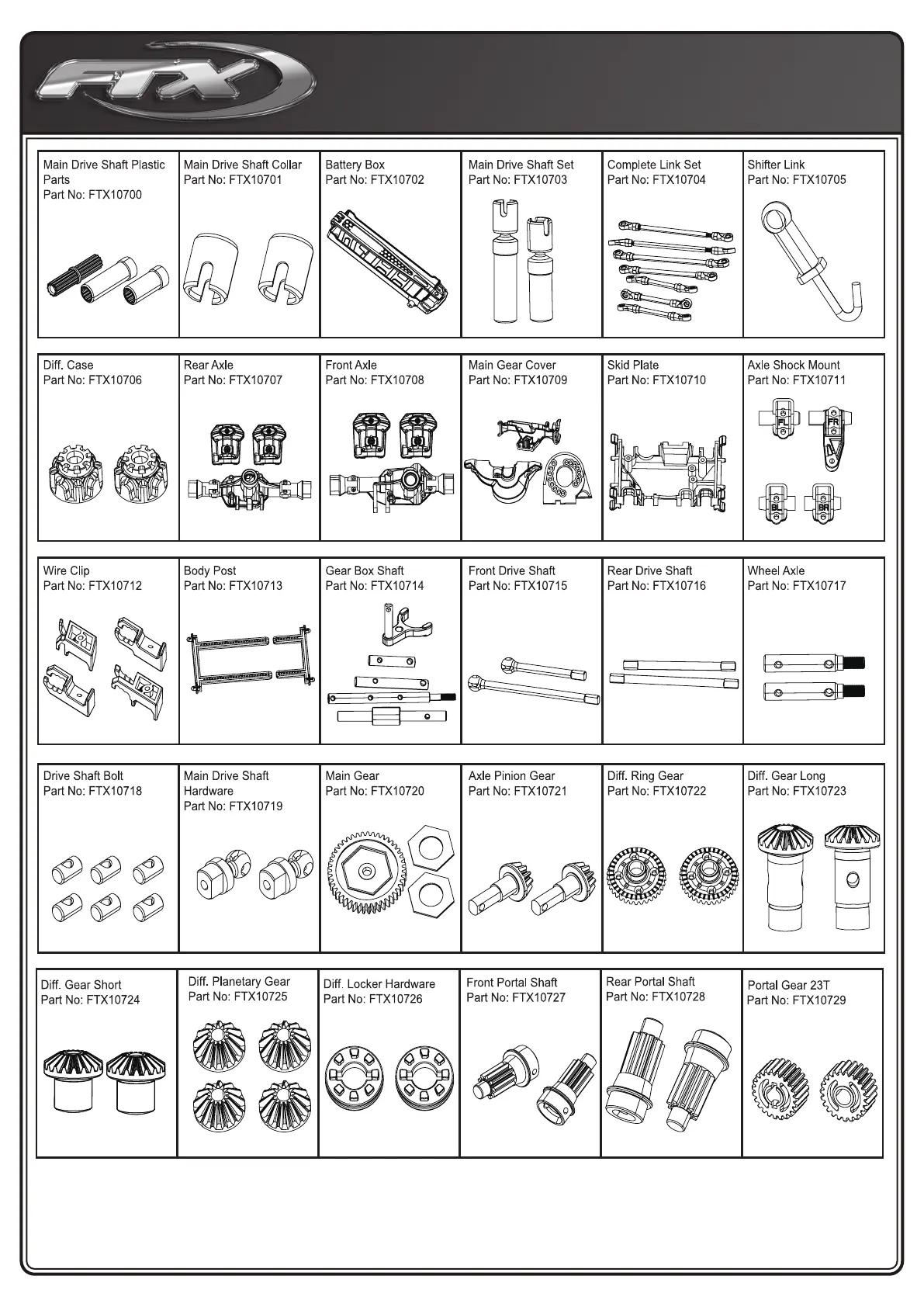 FTX GLADIUS - FTX Gladius Spare Parts Catalog; Drive Shaft and Drivetrain Parts; Axle and Differential Components; Chassis and Mounting Hardware
