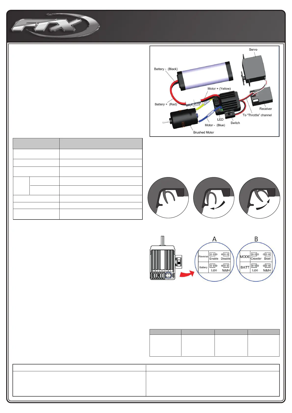the throttle channel of the receiver (Usually CH2). The “Motor +” and “Motor –” wires are