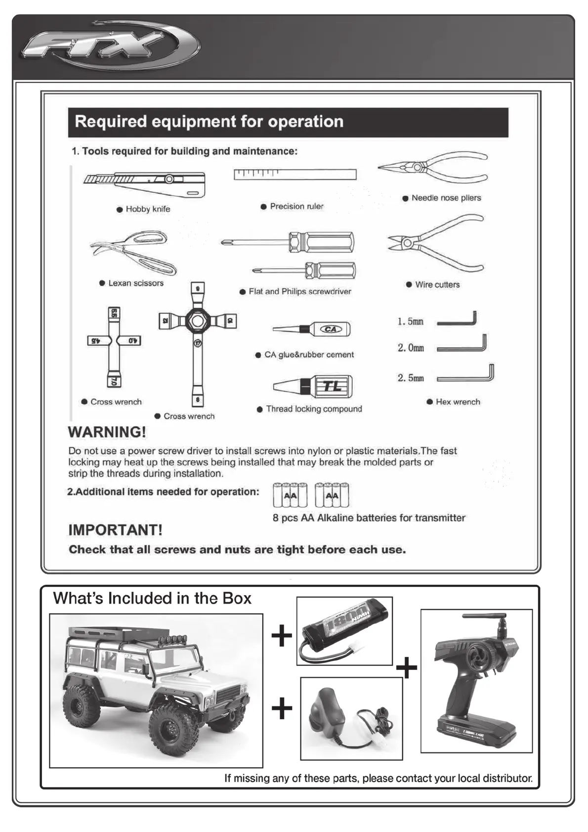 FTX Kanyon - Required Equipment for Operation; Tools for Building and Maintenance; Additional Items for Operation; Included Components