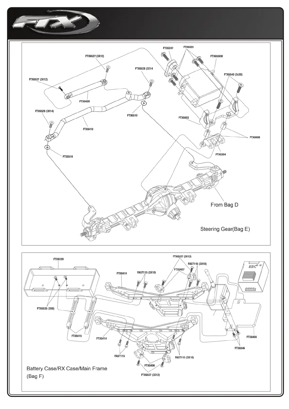 FTX Kanyon - Parts Diagram: Chassis and Steering; Steering Gear (Bag E); Main Frame and Battery Case (Bag F)