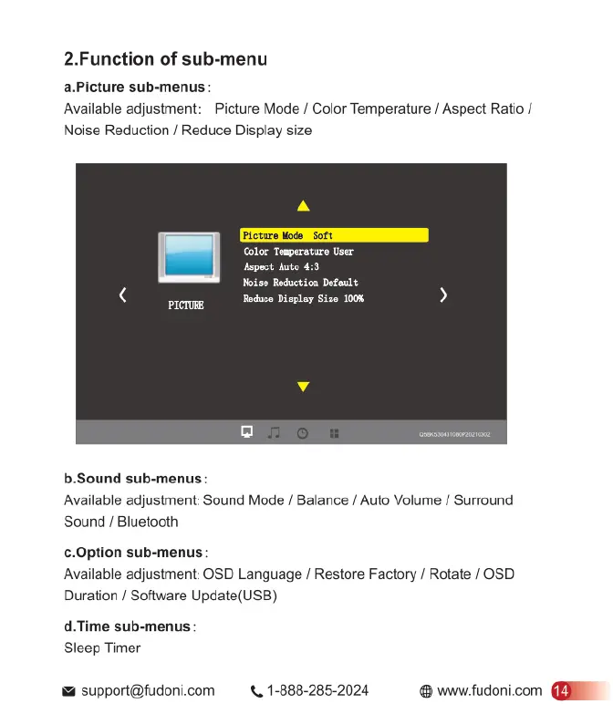 FUDONI P1 - Sub-Menu Functions and Options; Picture and Sound Sub-Menu Options; Option and Time Sub-Menu Settings