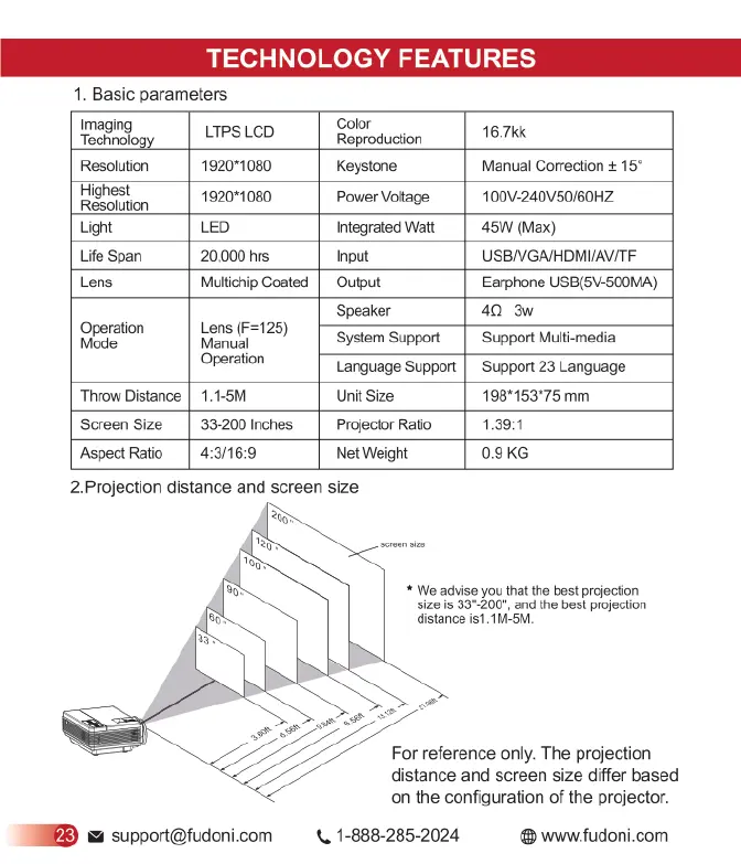 FUDONI P1 - Technology Features; Basic Projector Parameters; Projection Distance and Screen Size Guide