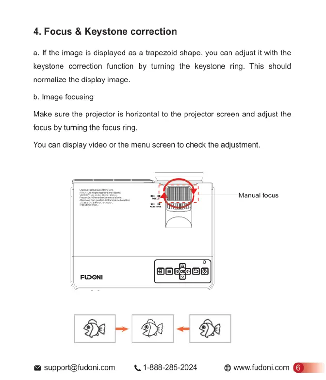 FUDONI P1 - Focus and Keystone Adjustment; Adjusting Image Trapezoid Distortion; Image Focusing Adjustment
