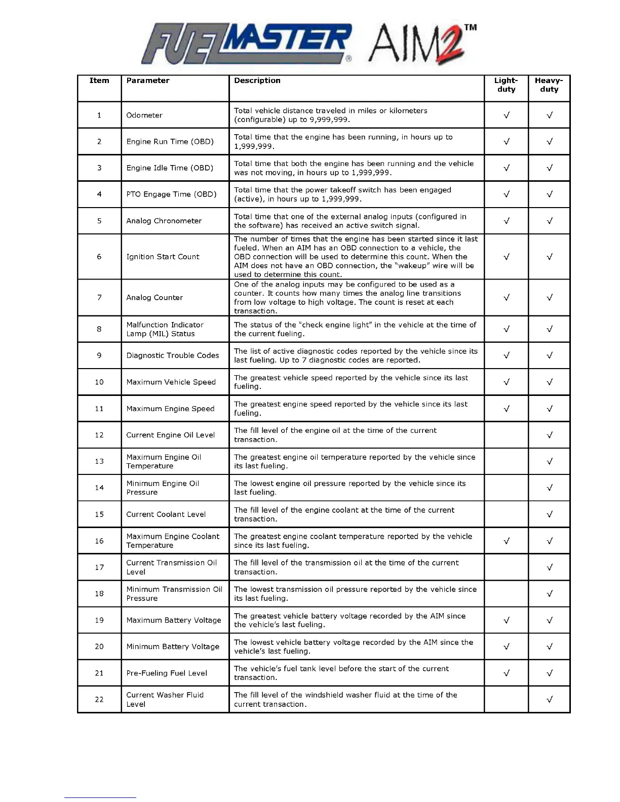 FUEL MASTER AIM 2 - Table 2-1. AIM2 OBD Data Collection Parameters