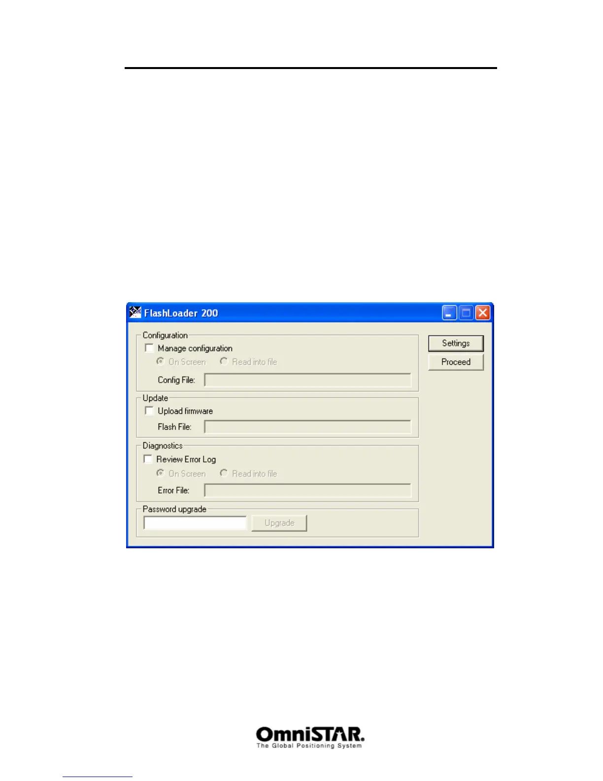 After installing and starting the flashloader 200 program, the following screen