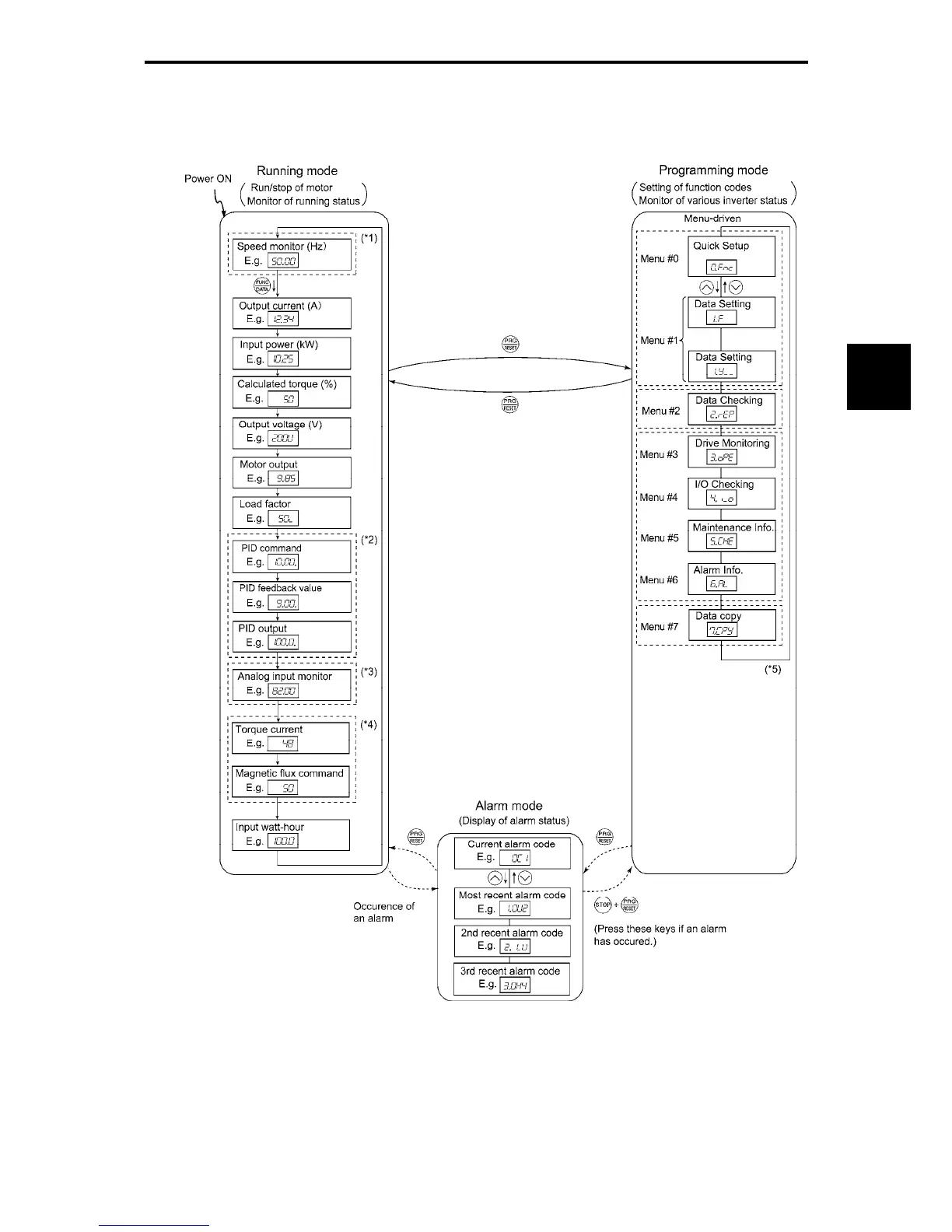 The figure below illustrates the transition of the LED monitor screen during Running mode, the transition