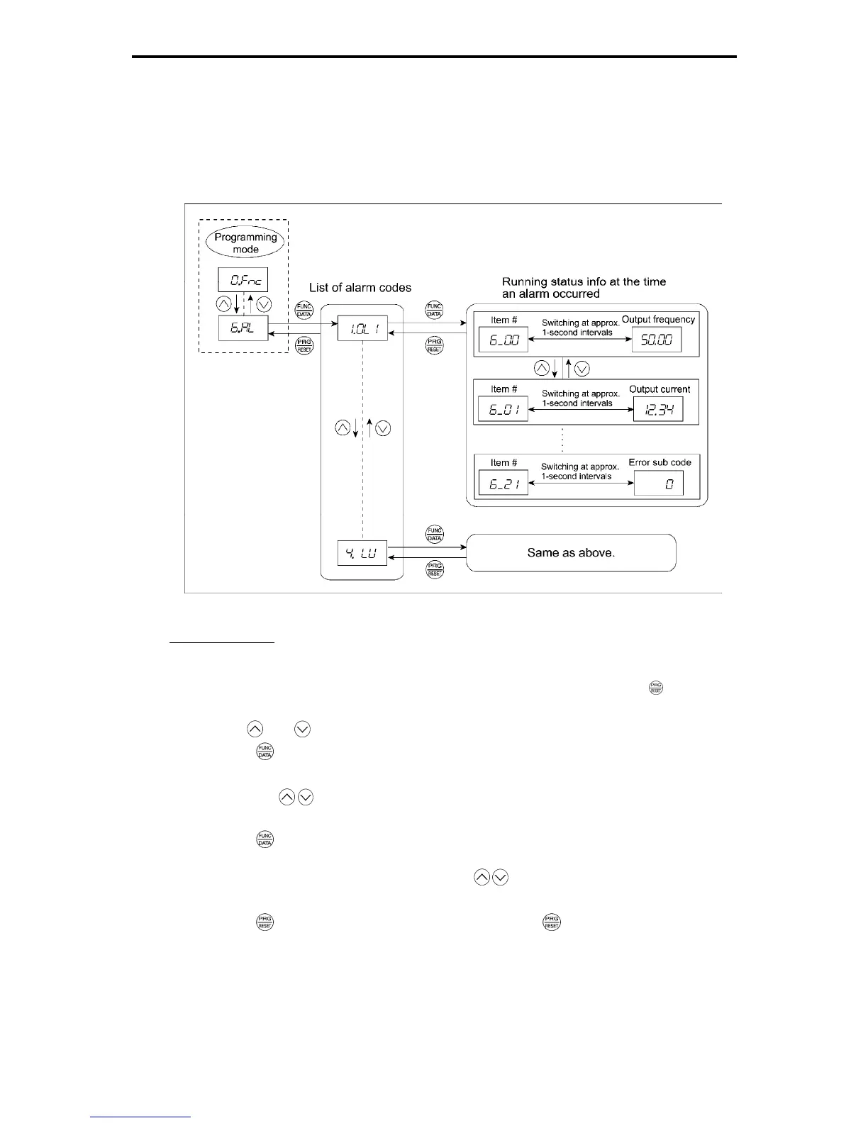 To view the alarm information, set function code E52 to "2" (Full-menu mode) beforehand.