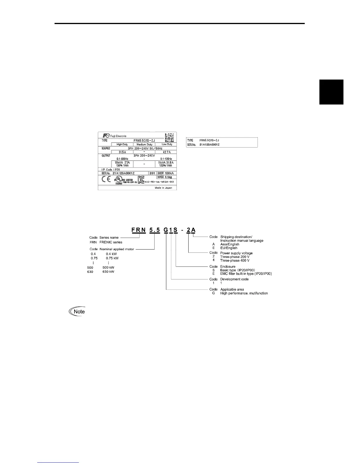 In this manual, inverter types are denoted as "FRN***G1-2J/4J." '' indicates an