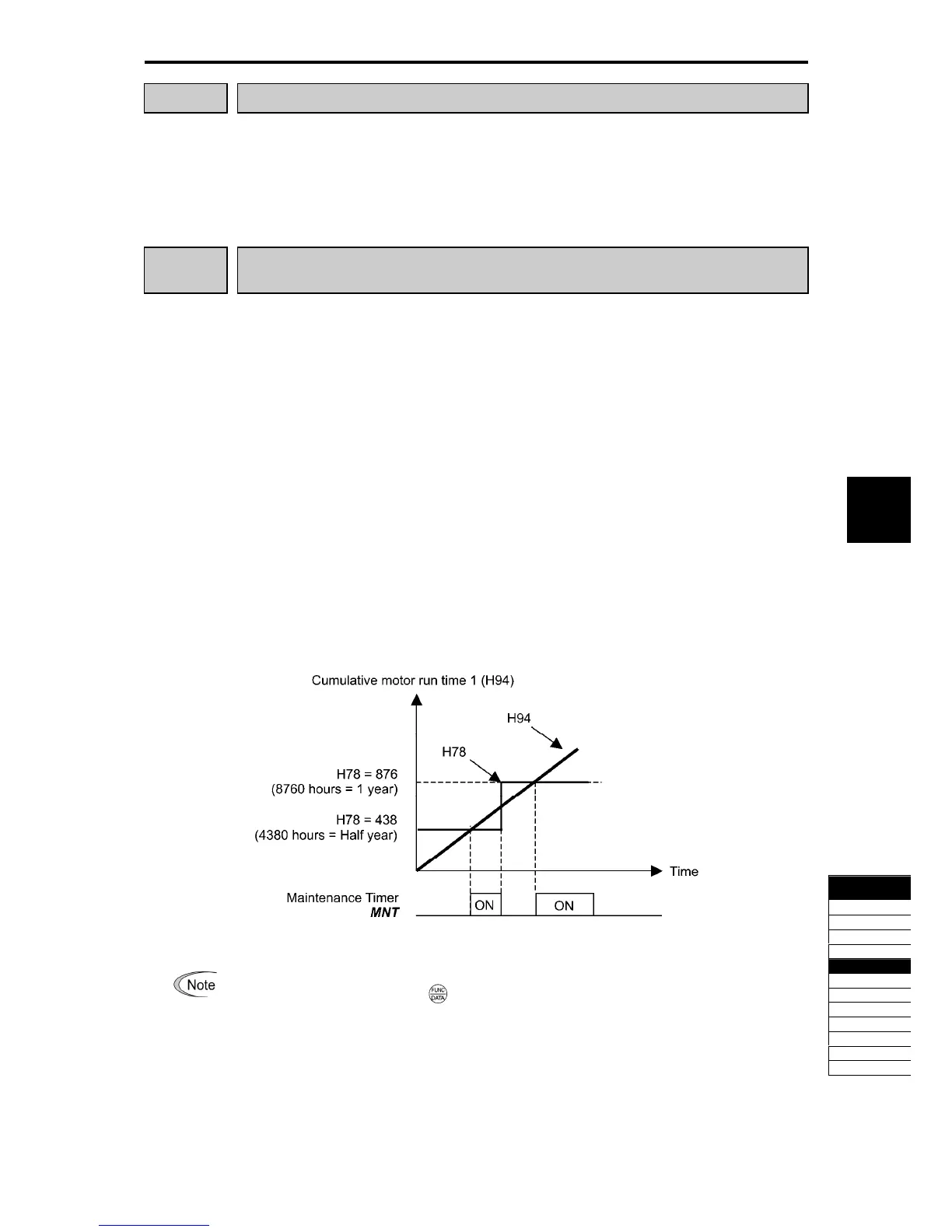 When Motor Cumulative Run Time 1 (H94) reaches the set maintenance set time (H78), the signal to start