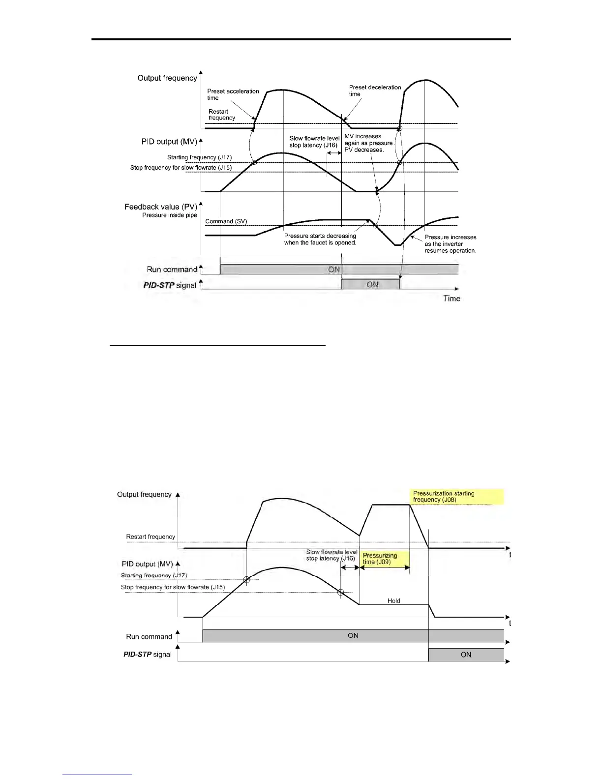 Specifying Pressurization starting frequency (J08) and Pressurizing time (J09) enables pressurization control