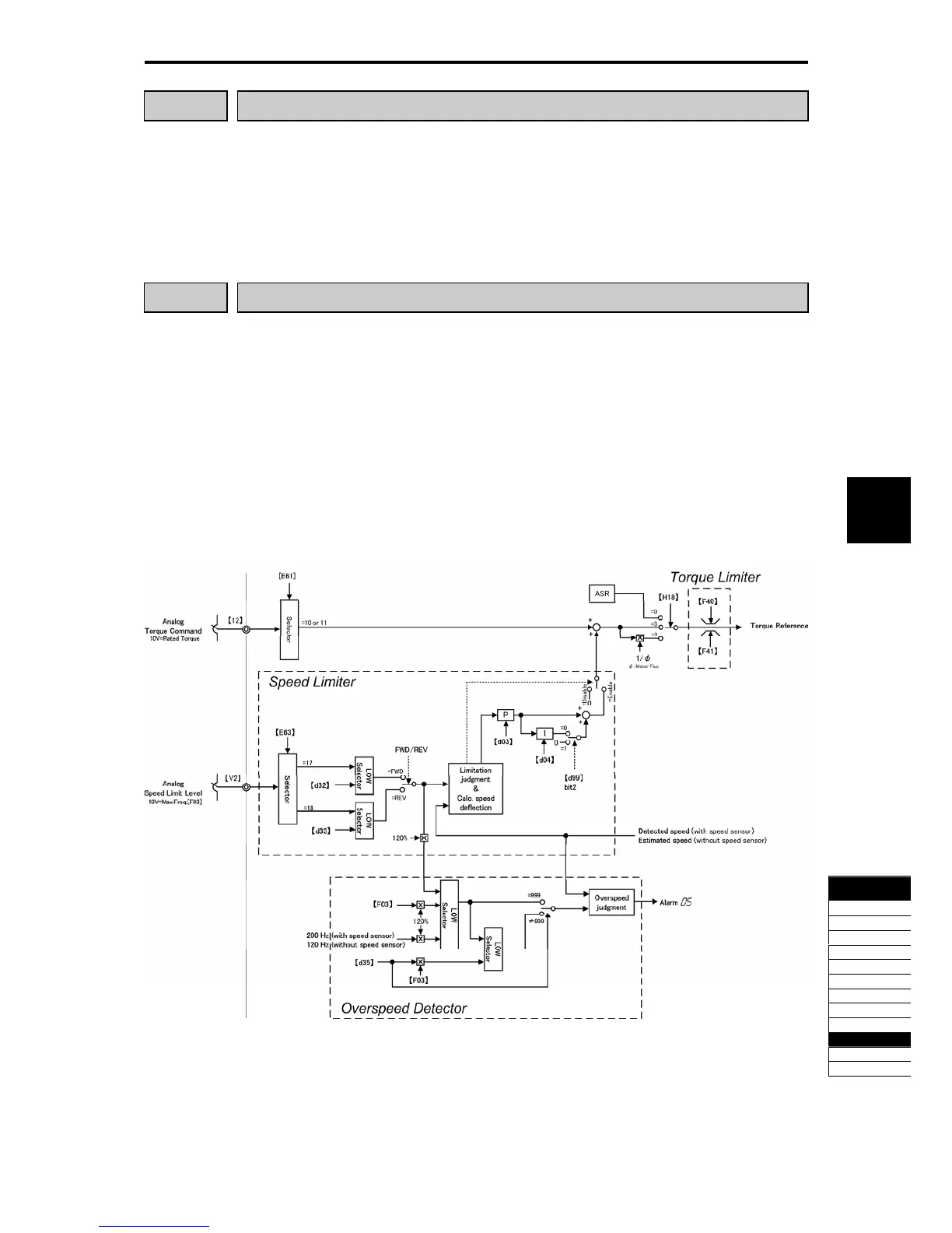 The overspeed detect level by the torque control can be set by using d35. The overspeed detect level is set