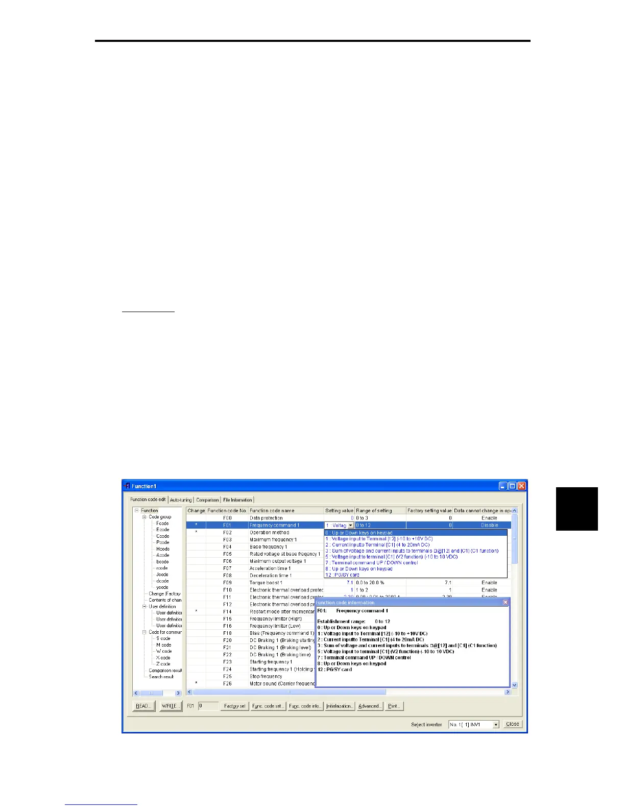 In List and edit, you can list and edit function codes with function code No., name, set value, set range,