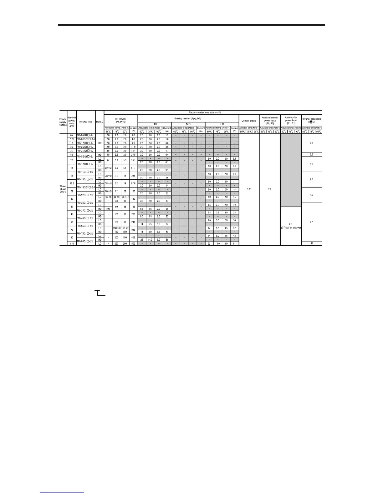 Table 11.2-2 Wire Size (for DC reactor, braking resistor, control circuits, and inverter grounding)