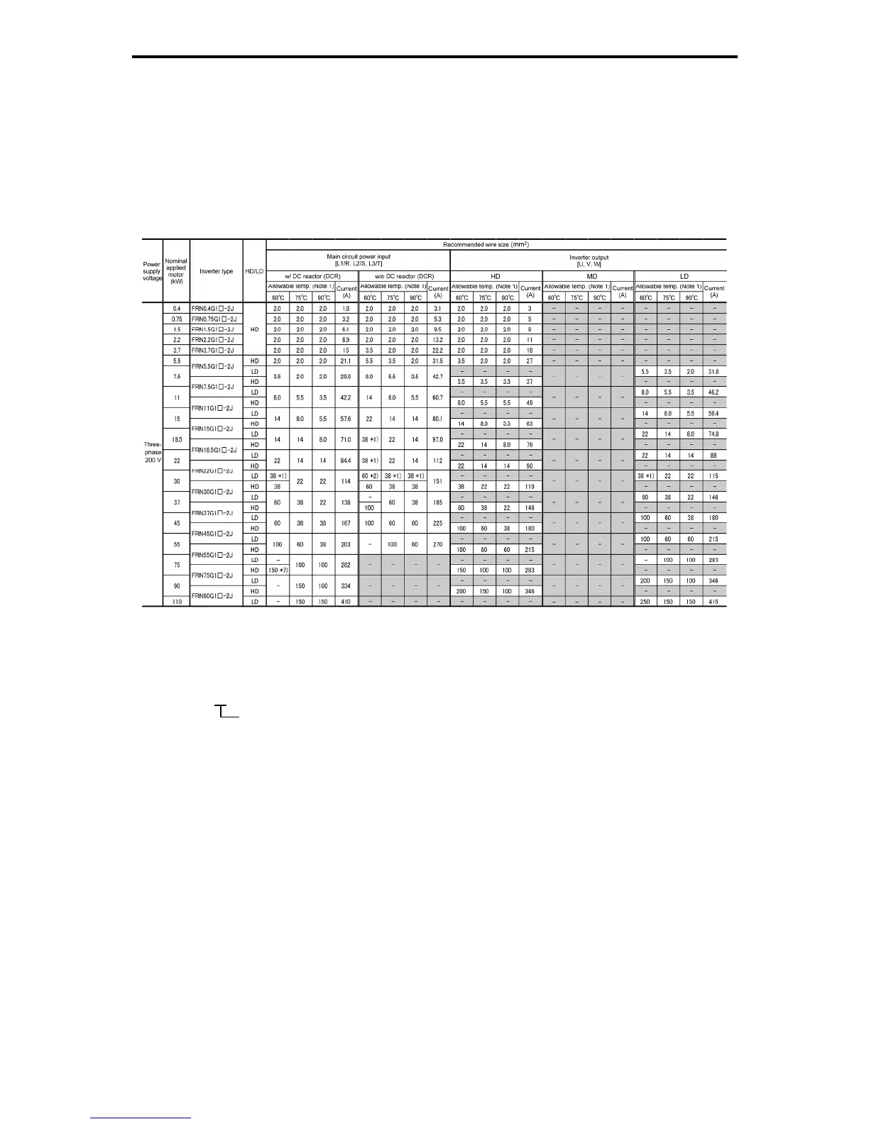 Table 11.2-3 Wire Size (for main circuit power input and inverter output)
