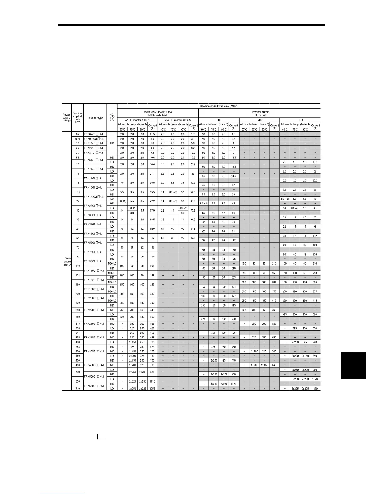 Table 11.2-3 Wire Size (for main circuit power input and inverter output) (Continued)