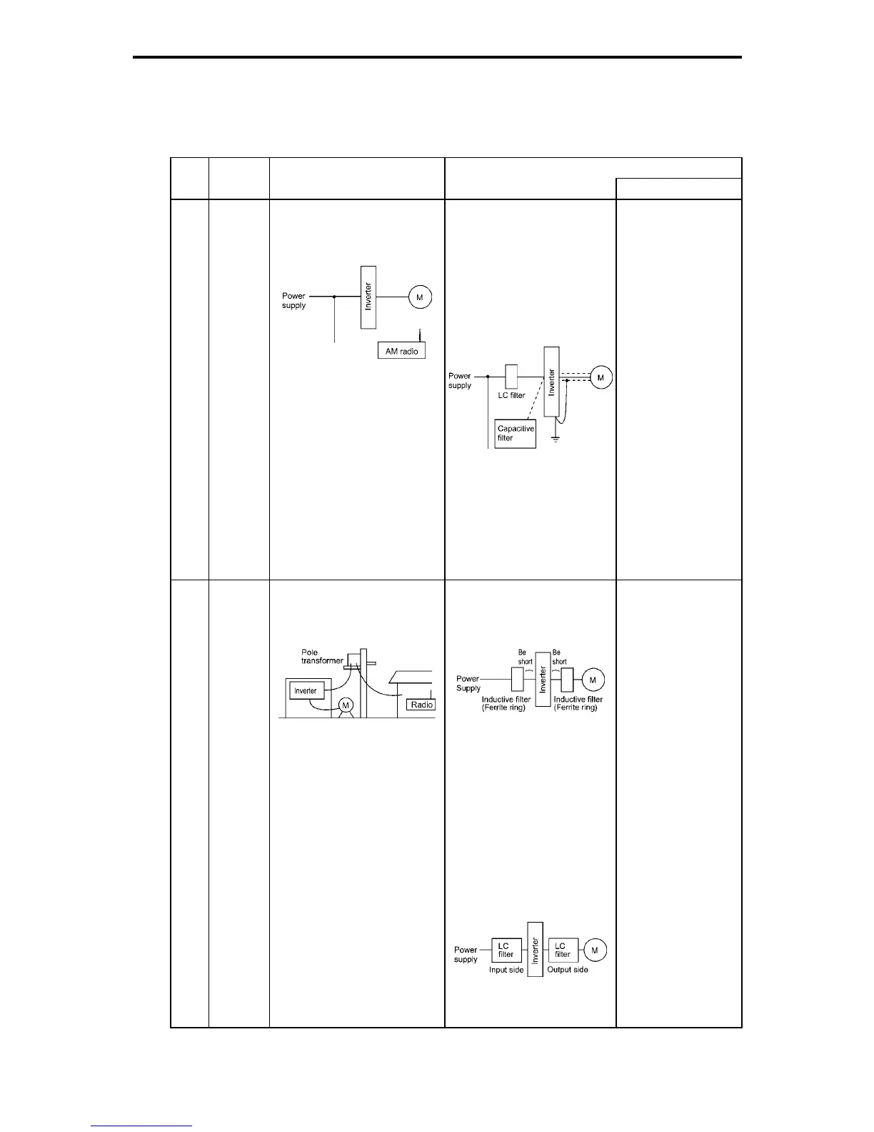 Table A-2 lists examples of the measures to prevent noise generated by a running inverter.