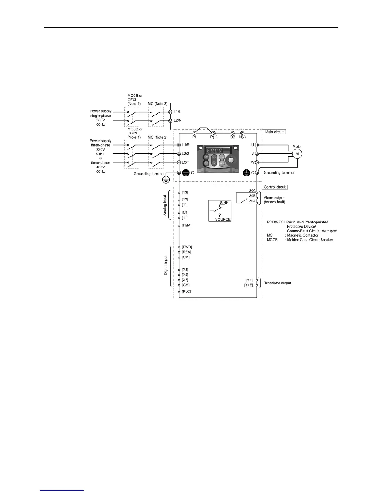 (Note 2) A magnetic contactor (MC) should, if necessary, be mounted independent of the MCCB or GFCI to cut off the power fed to the