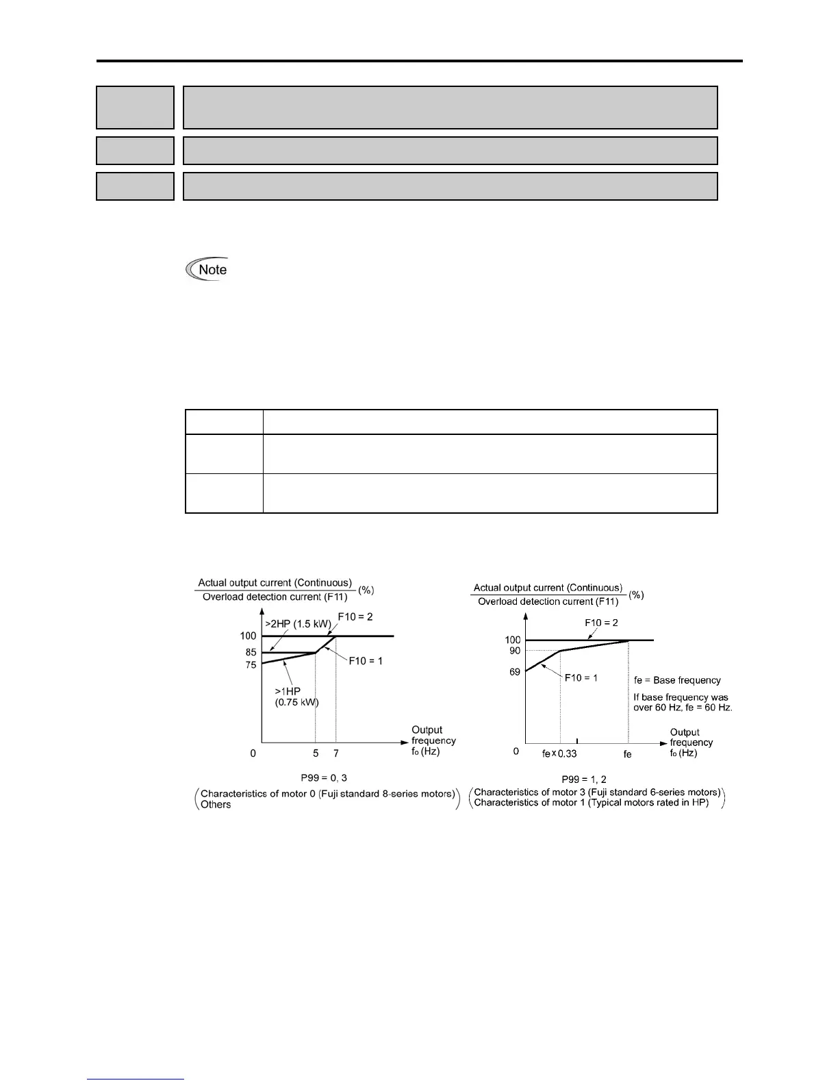 - In general, set the rated current of the motor when driven at base frequency to F11, that is, 1.0
