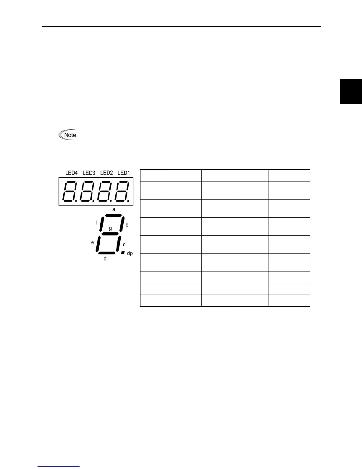 As shown in Table 3.10 and the figure below, segments "a" to "e" on LED1 light when the digital input