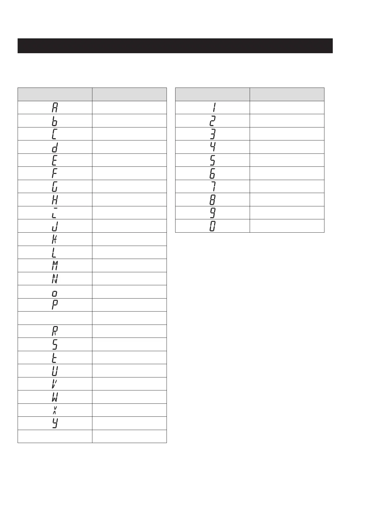 The following tables provide correspondence between digital characters used for the display of the controller and
