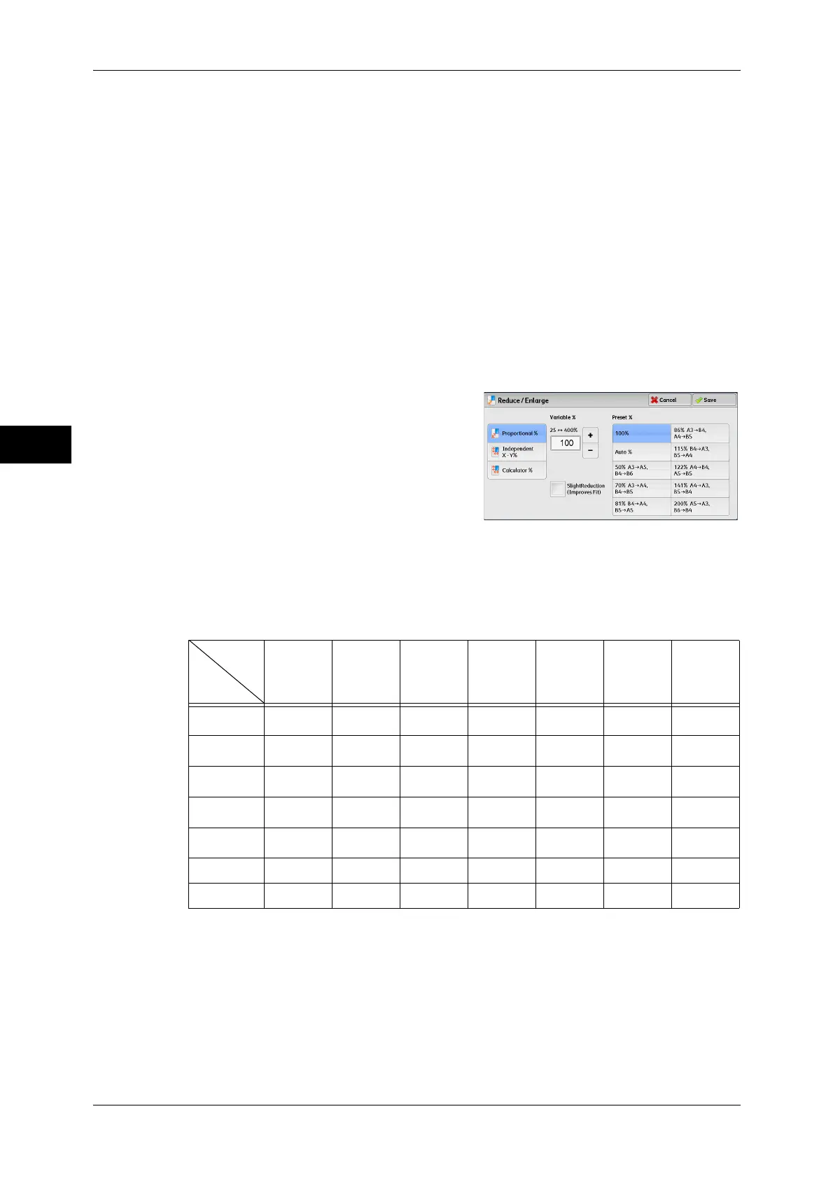 For information on the settings on the [Reduce/Enlarge] screen, refer to "When [Proportional %] is