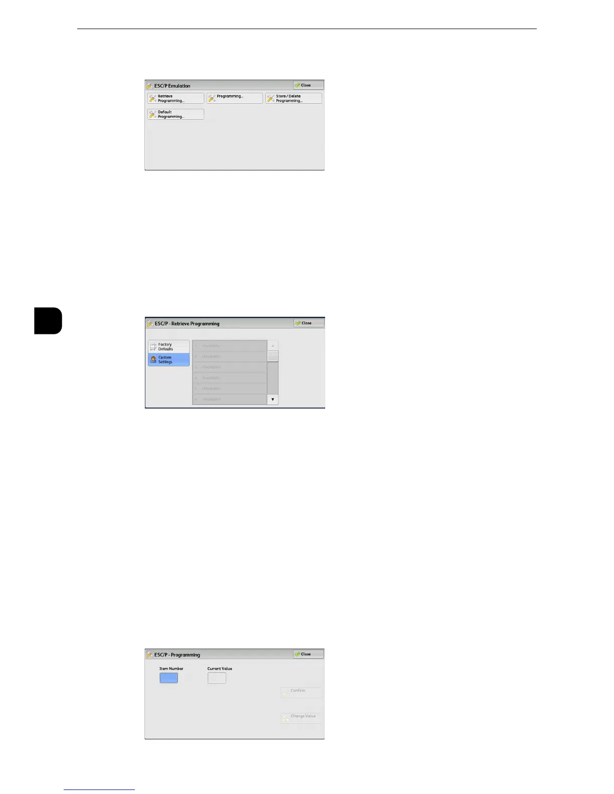 For the item numbers that can be configured in each mode menu, refer to "ESC/P-K Emulation Settings" (P.640), "PDF Direct Print