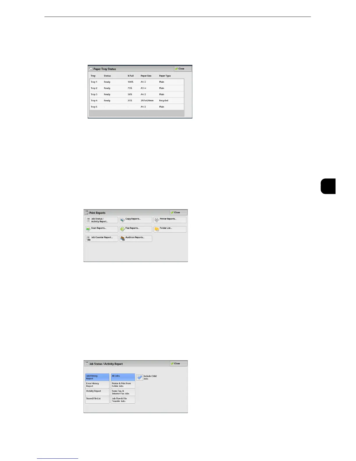 [Machine Information] > [Print Reports] > [Job Status/Activity Report].