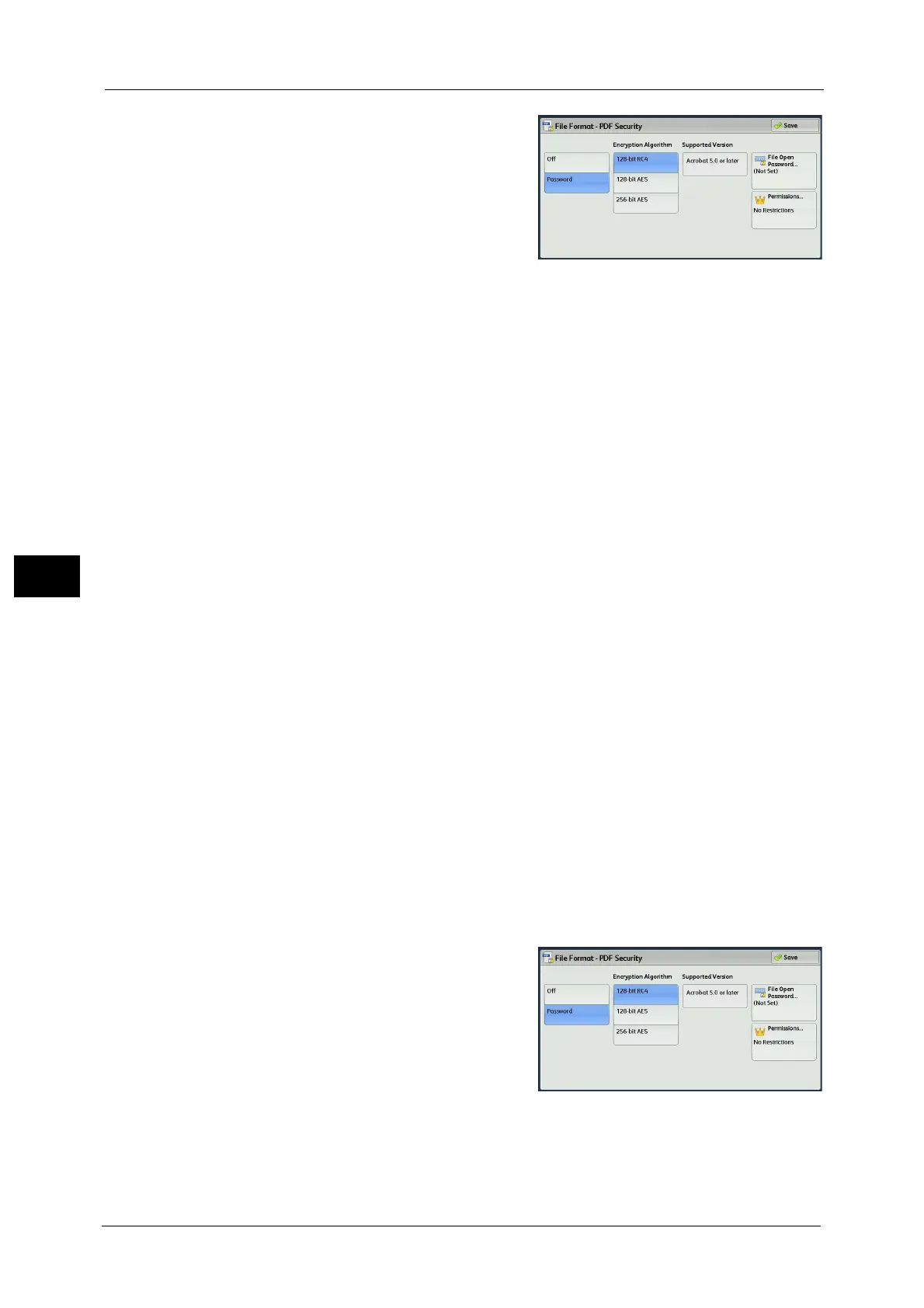 Refer to "[PDF Security - Permissions] Screen" (P.298).