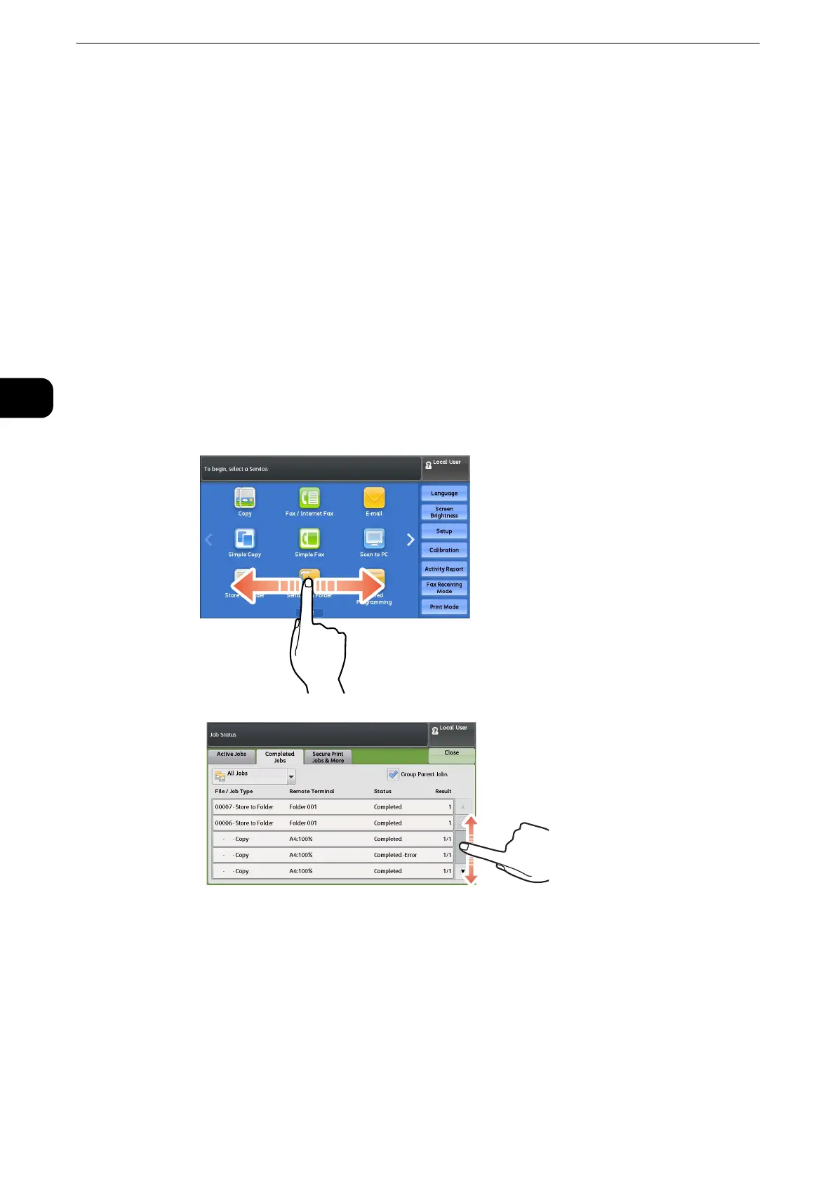 On the touch screen of the machine, you can switch pages and scroll a list by the following