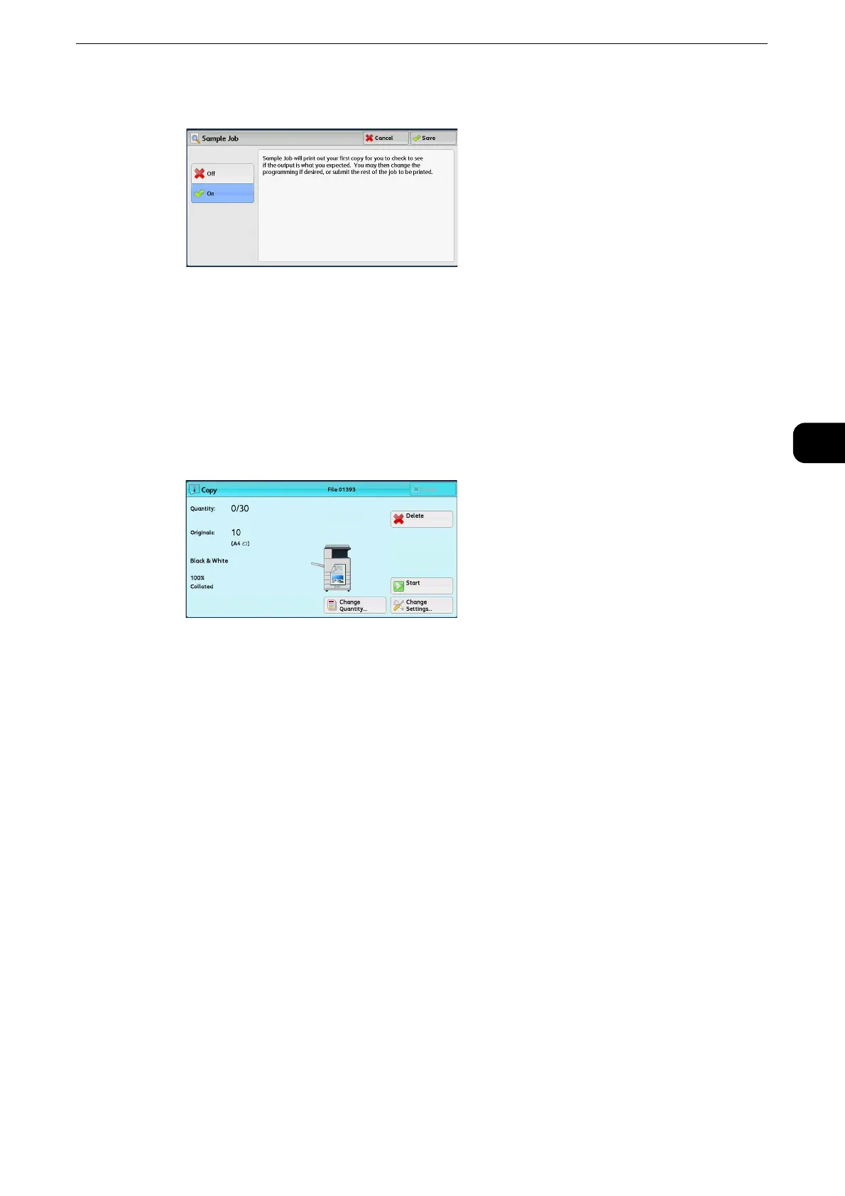 After the sample set is copied, the machine pauses the job and displays the [Copy] screen.