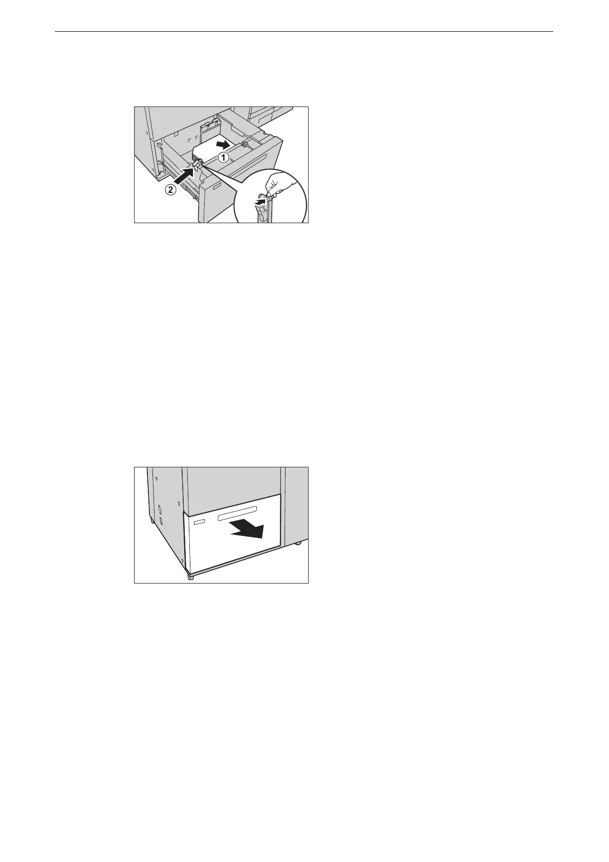 direction (1). Pinch the left short-side paper guide and slide it to the desired paper size (2).