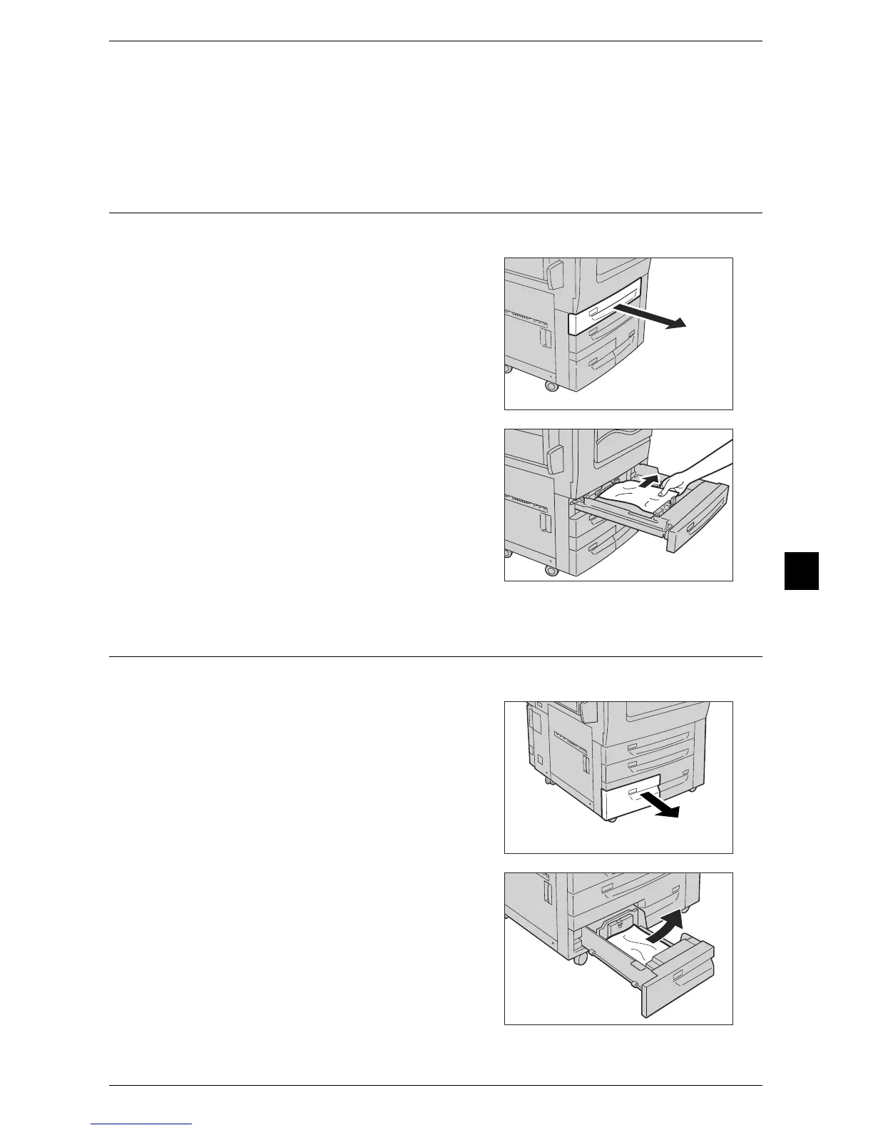The following describes how to clear paper jams occurring in Trays 1 and 2.