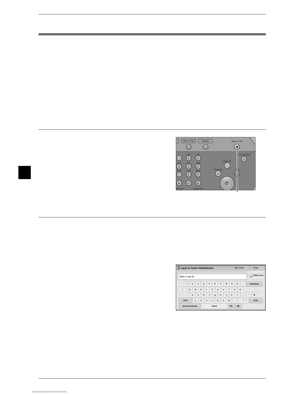 • The <Log In/Out> button is lit when the machine enters the System Administration mode.