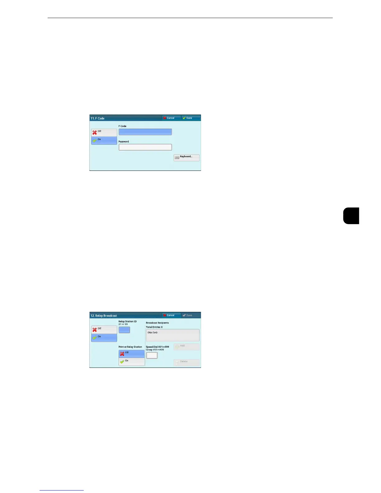 [On], set [Relay Station ID], [Print at Relay Station], and [BroadcastRecipients].