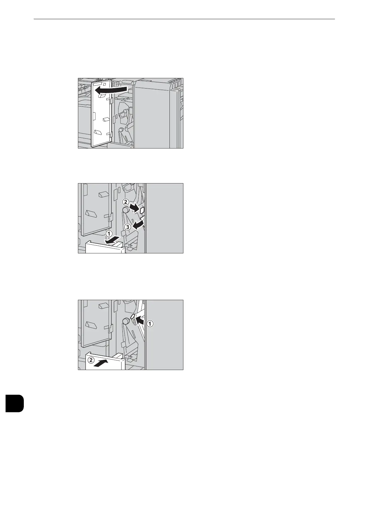 Pull out the Tri-fold output tray [2d] (1), and move the handle [2g] to the right (2). Remove